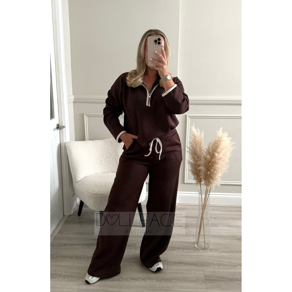 AMELIA Chocolate Half Zip Hooded Contrast Loungewear