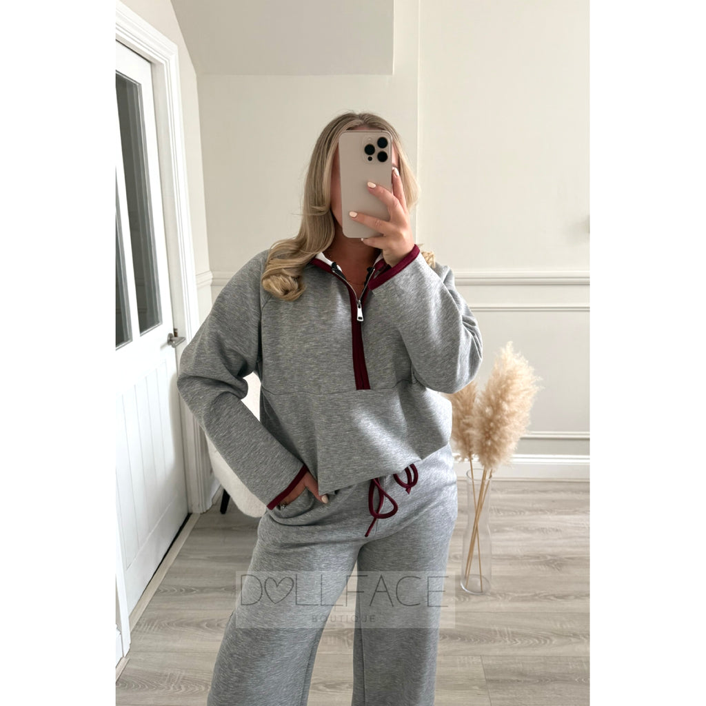 AMELIA Grey & Wine Half Zip Hooded Contrast Loungewear